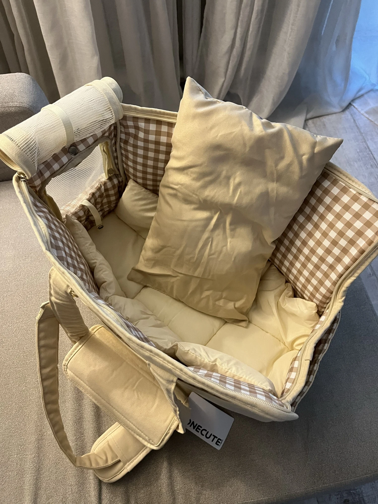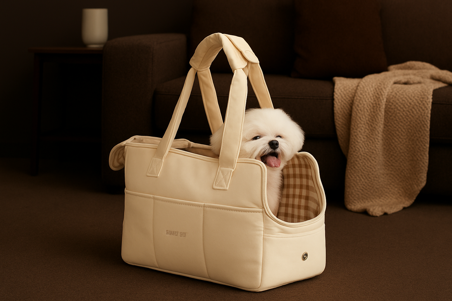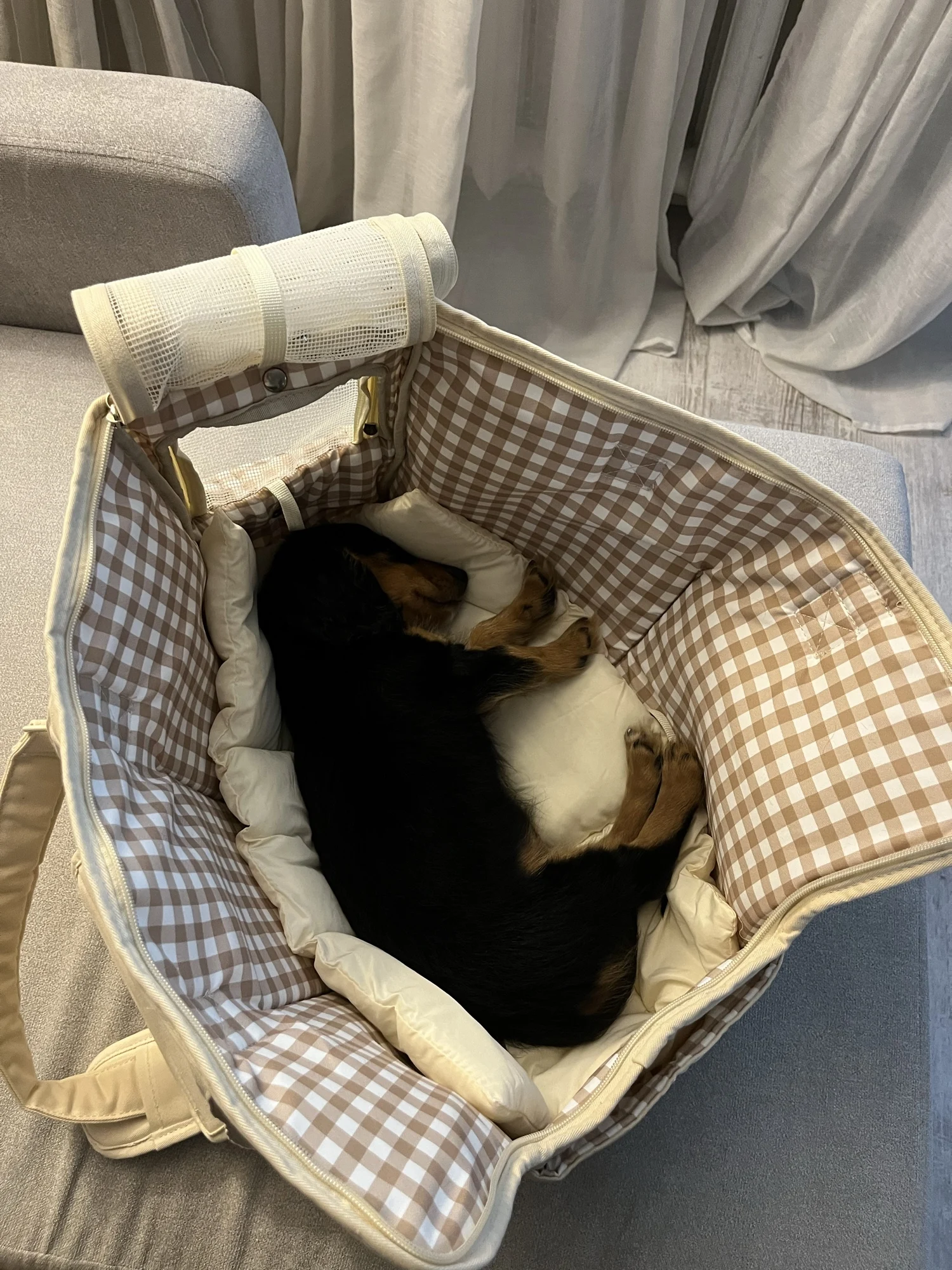 The bag is very pretty and the quality is good. It's durable but depending on the size and weight of your dog, it may fall if it's on the ground and they lean on the sides. It becomes a bit unstable with the large strap, and the weight of the little dog makes it lean more to one side than the other when it's on the shoulder. I have a Chihuahua weighing less than 1kg. But overall, I found it quite good.